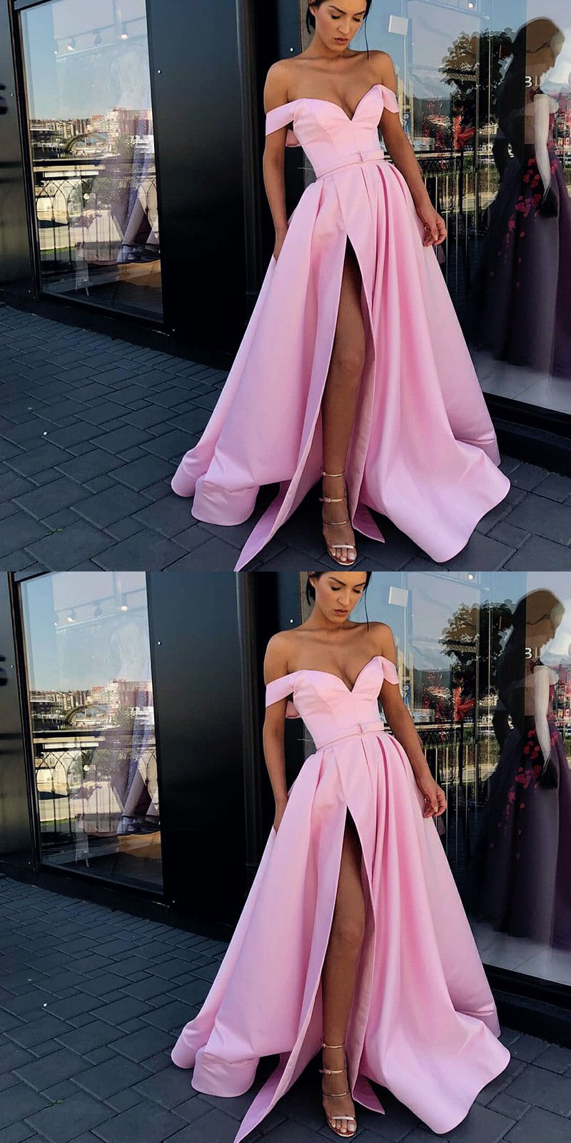 LP1178,A-Line Charming Off Shoulder Sweep Train Split Front Pink Best Sale Prom Dresses