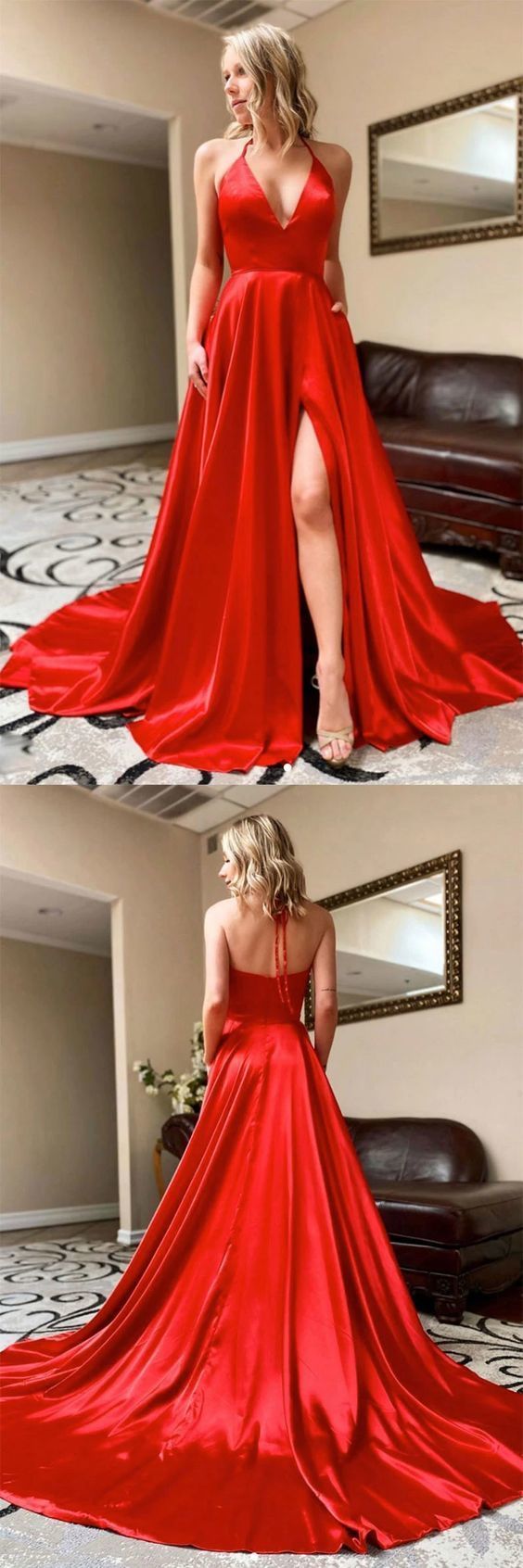 LP1219,Simple red v neck satin long prom dress red evening dress
