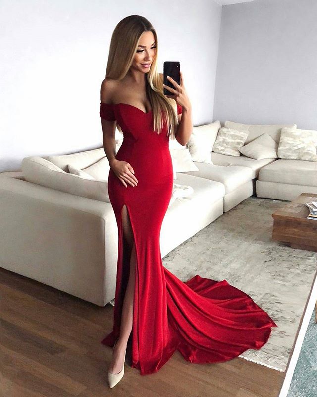 LP1365,Burgundy Satin Mermaid Prom Dress, Off the Shoulder Split Prom Dresses,Wedding Party Dress,Evening Party Gowns