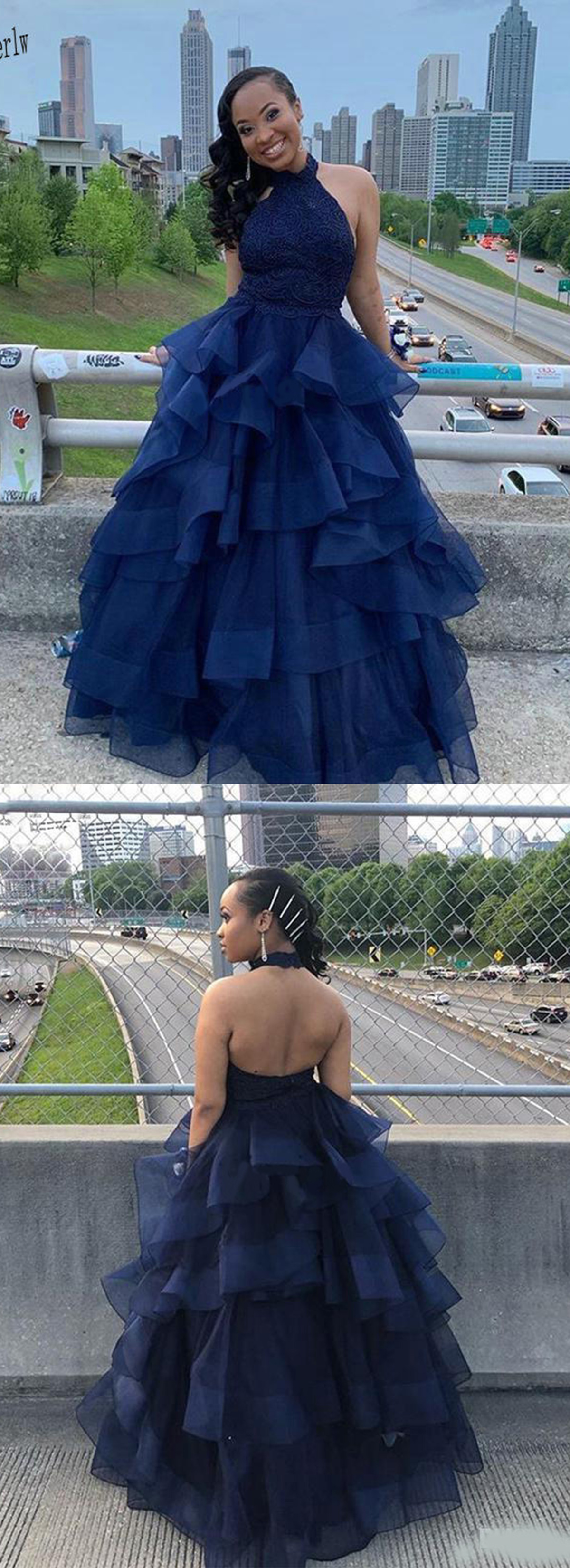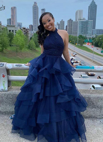 LP1398,Navy Blue Tulle Backless Cascading Ruffles Lace Prom Dress Sweet 16 Quinceanera Dress