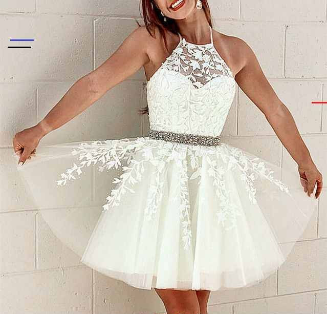 LP1006,A-line knee length halter neckline homecoming dress,White tulle lace juniors' dress