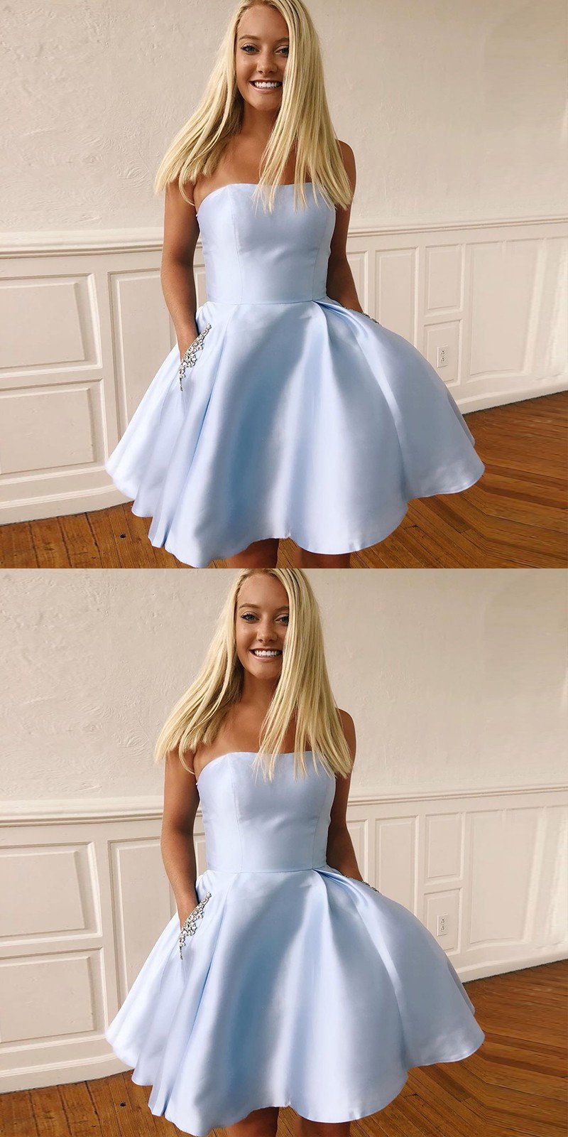 LP1083,A-Line Strapless Beading Light Blue Homecoming Dresses With Pockets