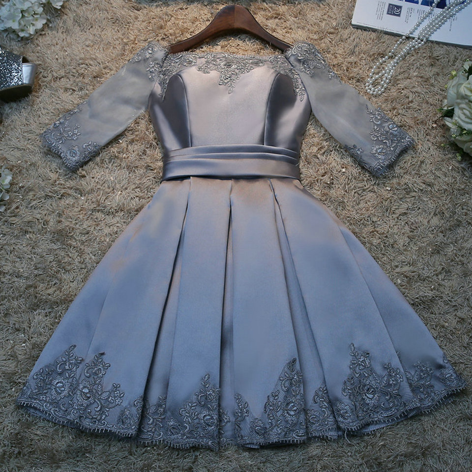 LP1121,Sexy Short Sleeve Lace Stain Prom Dress,Grey Satin Homecoming Dress