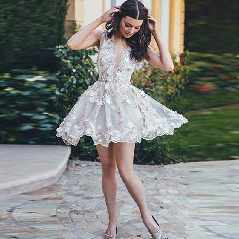LP1136,V-Neck Appliques Homecoming Dress,Sleeveless Short Prom Dress,Tulle Appliques Graduation Dress