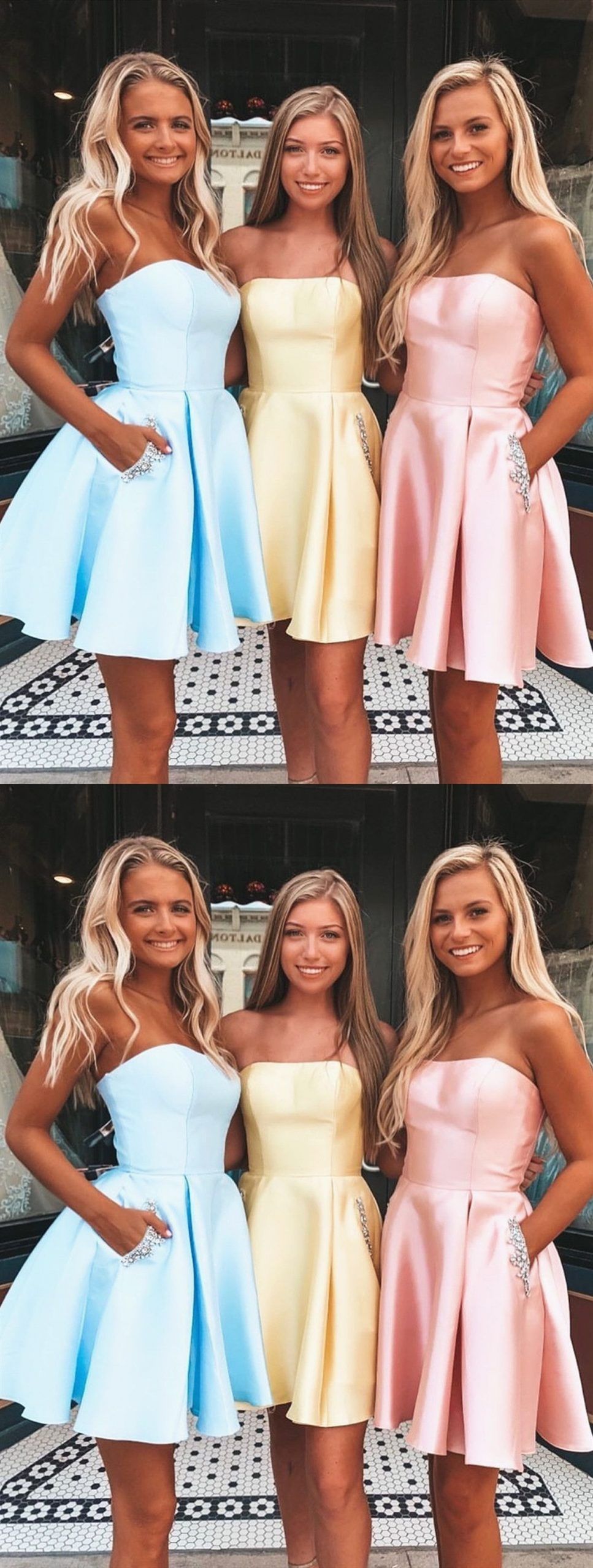 LP1230,A Line Strapless Light Blue Short Homecoming Dress With Pockets Beading