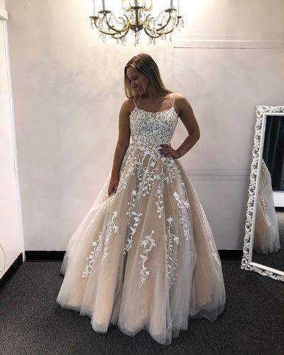 LP1267,Gorgeous A Line Spaghetti Straps Champagne Long Prom/Evening Dress with Appliques