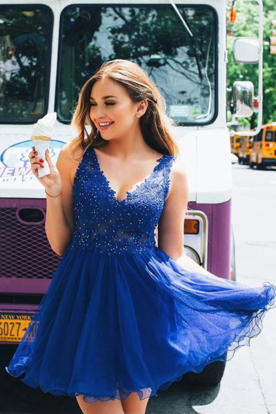 LP1417,Cute A Line V Neck Royal Blue Short Homecoming Dress Appliques