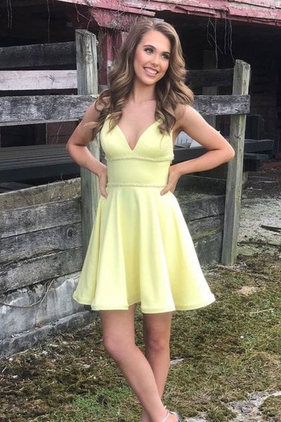 LP1422,Cute A Line V Neck Yellow Short Homecoming Dresses