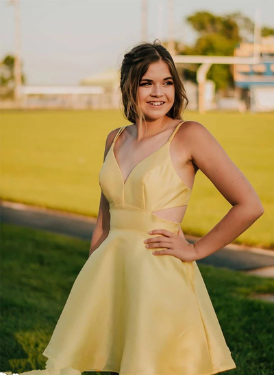 LP1432,Stylish A Line V Neck Yellow Short Homecoming Party Dresses Criss Cross