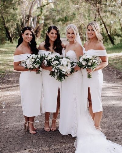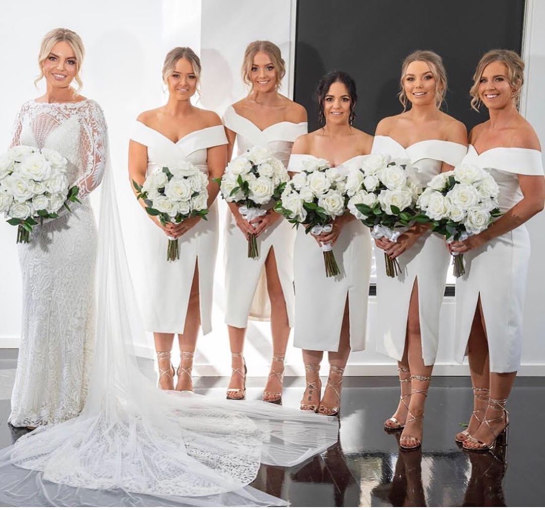 LP1255,Beautiful Sheath Off the Shoulder White Tea Length Bridesmaid Dress