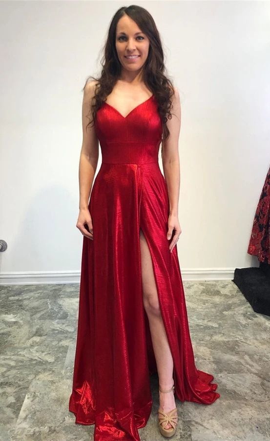 LP1214,simple red satin prom dresses, lace up red satin prom dresses, slit red satin prom dresses, vneck red satin prom dress