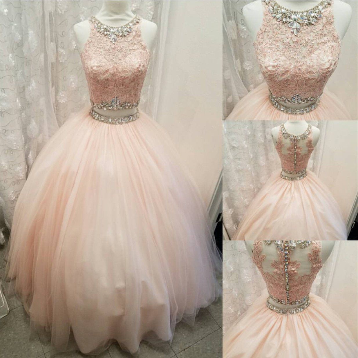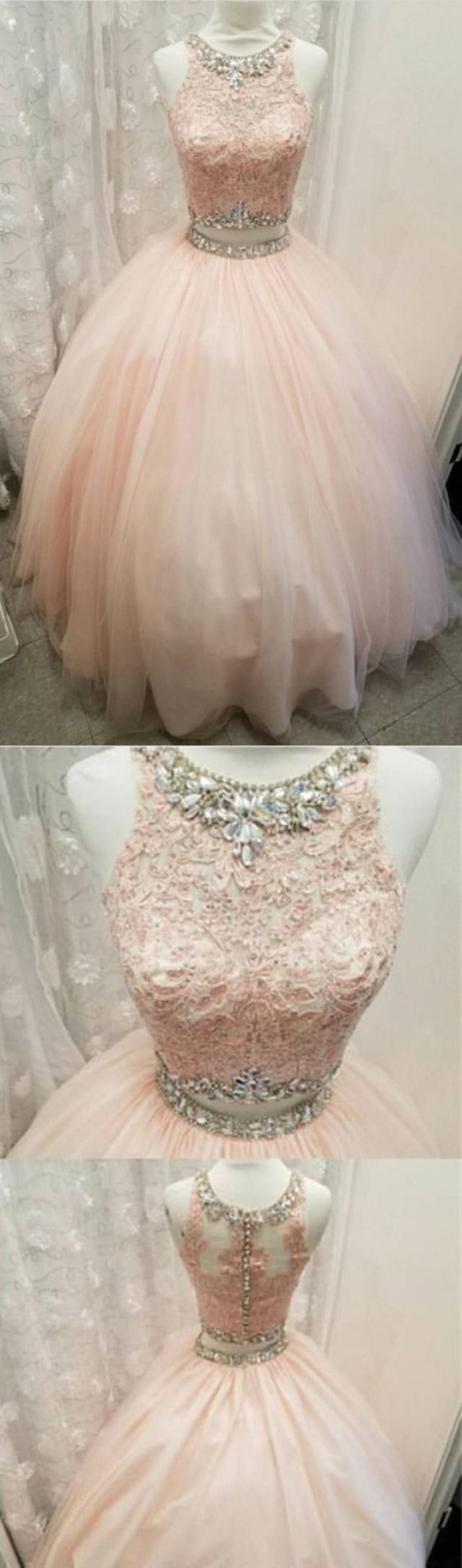 LP1327,Elegant Lace Crop Top Pink Tulle Ball Gown Quinceanera Dresses Two Piece