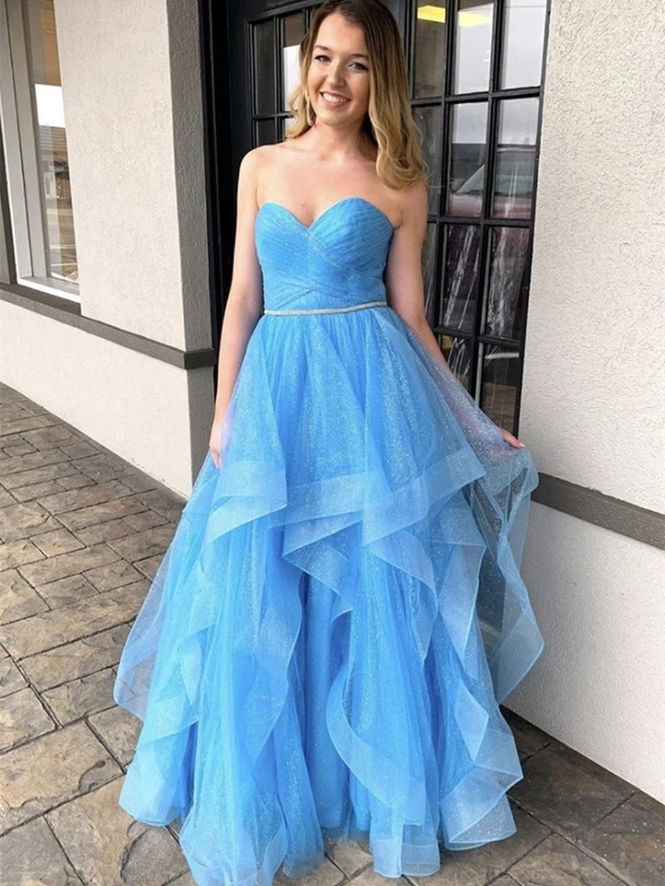 LP1373,Sweetheart Blue Tulle Strapless Ruffles Long Prom Dress Evening Dress