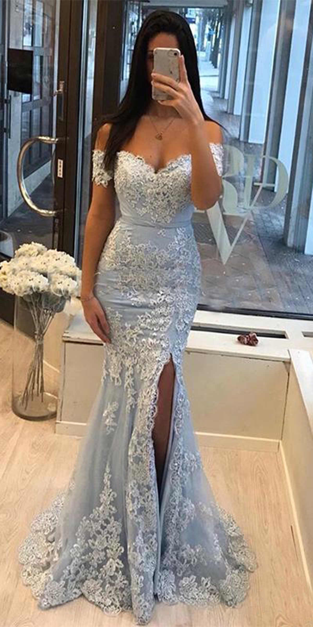 LP1396,Blue Off the Shoulder Front Split Mermaid Dress Prom Dress